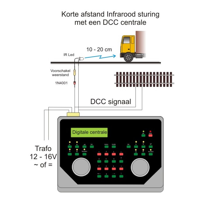 With this set, you are able to  control the DC-Car vehicles by a DCC station by means of short range IR.