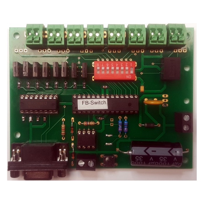 The function decoder is completely assembled and tested supplied with 8 IR LED's and shunt resistors. The unit is supplied with a digital input so the outputs can be switched On and Off via digital station. There is also a RS232 interface available for connecting to a PC or to the Input print. The latest makes is possible to control the outputs with switches, contact, Hall sensor and so on.