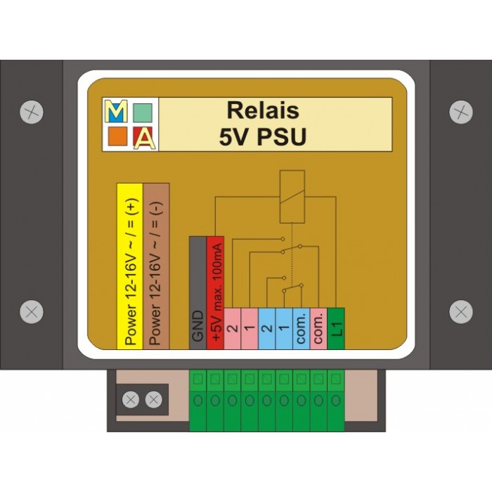 Relais met 5Volt voeding in een behuizing en voorzien van handige zelf klemmende contacten.