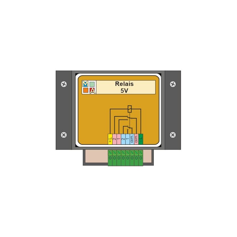 Relais in een behuizing en voorzien van handige zelf klemmende contacten. Door de lage stroom kan dit relais ook geschakeld worden d.m.v. reedcontacten, Hall sensoren etc.