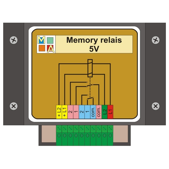 Geheugen relais met dubbele spoelen in een behuizing en voorzien van handige zelf klemmende contacten. Een puls op de ene spoel zet het relais aan, een puls op de andere zet het relais uit. Door de lage stroom kan dit relais ook geschakeld worden d.m.v. reedcontacten, Hall sensoren etc.