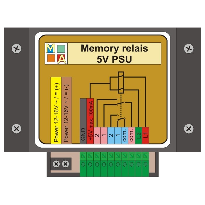 Geheugen relais met dubbele spoelen in een behuizing en voorzien van handige zelf klemmende contacten. Een puls op de ene spoel zet het relais aan, een puls op de andere zet het relais uit. Door de lage stroom kan dit relais ook geschakeld worden d.m.v. reedcontacten, Hall sensoren etc.